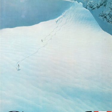 Original vintage ski travel poster for Canada featuring skiers skiing down a mountain slope leaving trails in the snow behind them, the bold black lettering with the maple leaf Canadian flag above the last a below. Very good condition, minor restored creasing, backed on linen.