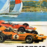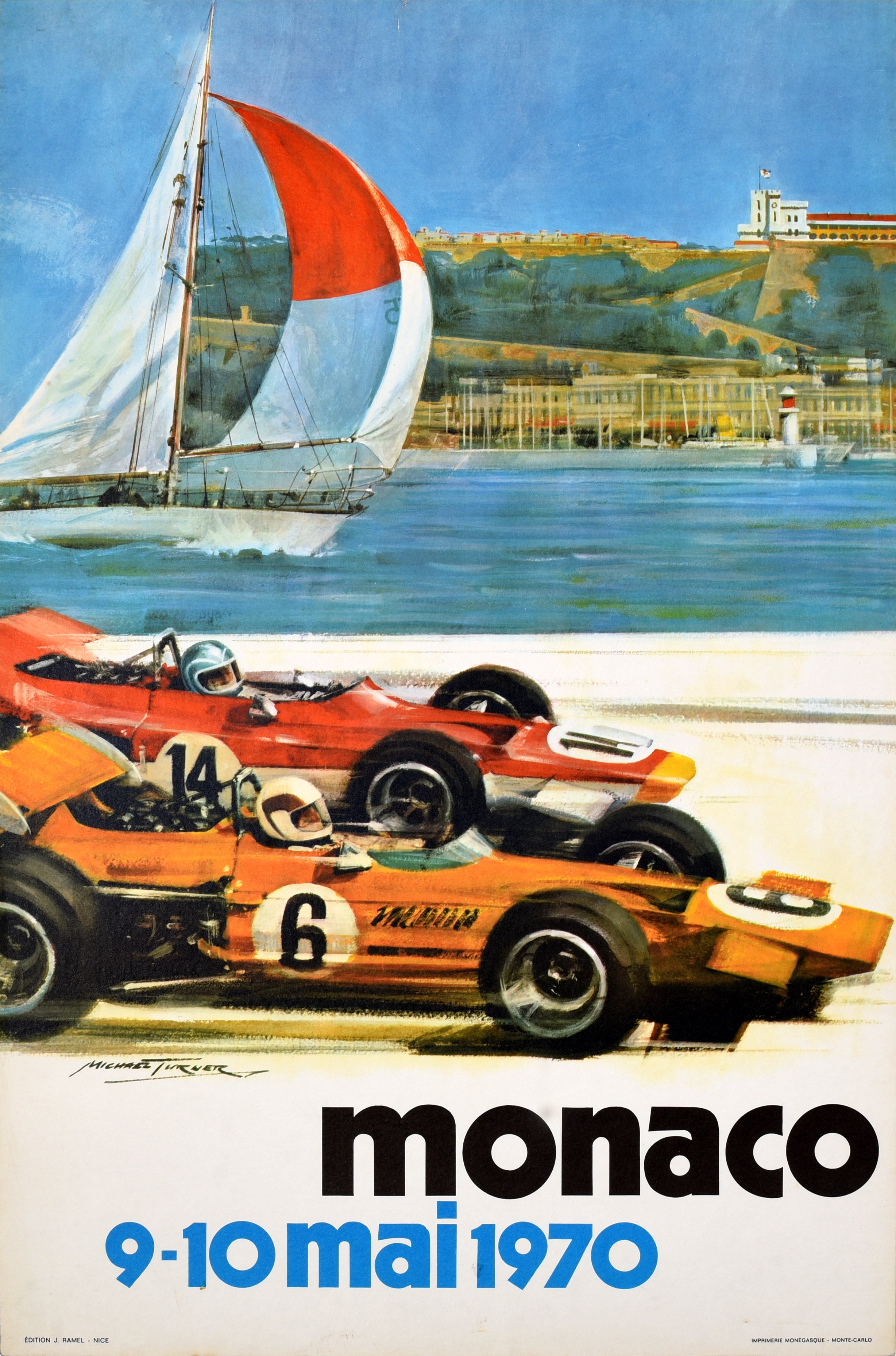 Original vintage sport poster for the Monaco Grand Prix 9-10 May 1970 featuring a dynamic illustration of two formula one cars racing on a road alongside a sailing boat on the water with a lighthouse and buildings on the hillside in the background. Held since 1929, the annual Monaco Grand Prix Formula One motor race is considered to be one of the most important automobile races in the world. Very good condition, light staining, restored tear, backed on linen.