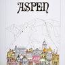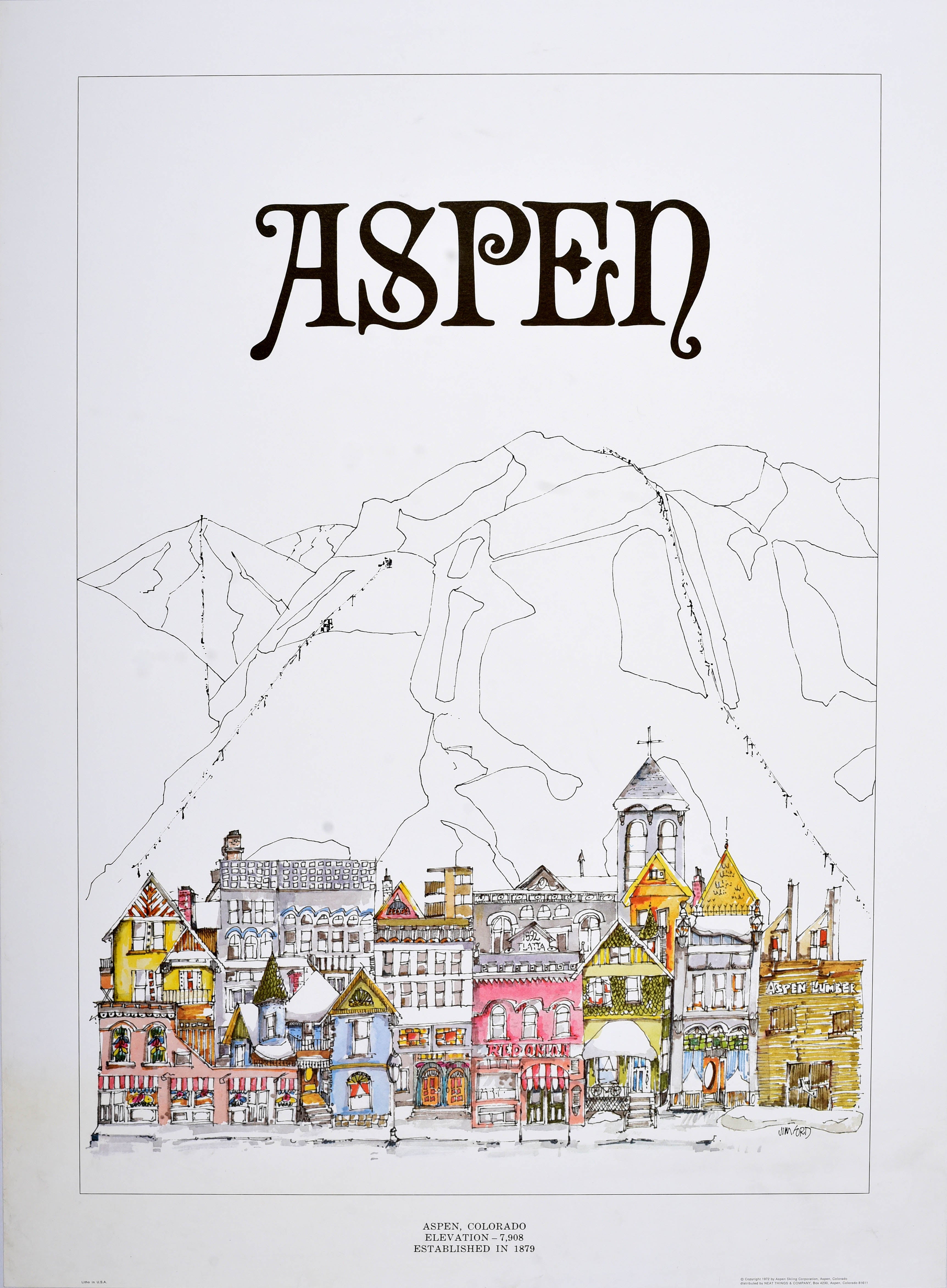 Original vintage ski and winter sport travel poster for Aspen in Colorado featuring a detailed illustration by Jim Ford (1929-2019) of the popular historic ski resort town at the base of the Rocky Mountains and ski slopes in the background, the stylised title text above and caption below - Aspen, Colorado Elevation 7908 Established in 1879. Produced for an advertising campaign by the Aspen Skiing Corporation. Distributed by Neat Things and Company. Very good condition, creasing, staining, backed on linen.