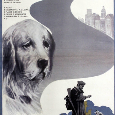 Original vintage movie poster for a Russian film, White Bim Black Ear (Белый Бим Черное ухо / Belyy Bim Chernoe ukho), featuring images of the dog called Bim as he looks for his owner along a stylised road with a man holding a rifle feeding him on one side and a city in the distance. Very good condition, light folds.