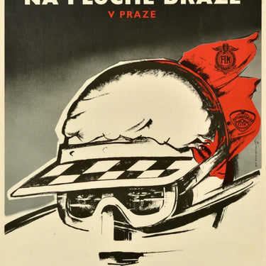 Original vintage motorsport poster for the World Championship Continental Individual Final in Prague - Mistrovstvi Sveta Kontinentalni Finale Jednotlivcu na Ploche Draze v Praze Praha Stadion Marketa - held on 1 July 1978 at 8pm featuring a dynamic black and white illustration of a driver with a checkered pattern on his helmet and his eyes visible behind his racing goggles, the FIM and CSSR Automotoklub logos on red flags flying behind him to show speed with the text above and below. Opened in the 1930s the Stadion Marketa Stadium athletics ground and speedway track is host to the motorcycle speedway and other sport events. Good condition, creasing, tears, staining.