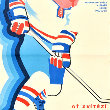 Original vintage winter sport poster for the 1978 Ice Hockey World Championships / Mistrovstvi Sveta v Lednim Hokeji Praha 78 held in Pragu, Czechoslovakia from 26 April to 14 May 1978 - At zvitezi sportovni pratelstvi a dobry sport! / And long live sports teams and a good sport! - featuring an illustration of a hockey player in uniform wearing a helmet and gloves skating at speed on ice skates holding his hockey stick above the caption in red, the event logo in blue above. Eight teams competed in this 45th World Championship event, which was won by the Soviet Union USSR team followed by Czechoslovakia in second place and Canada in third place. Good condition, folds, creasing, small tears.