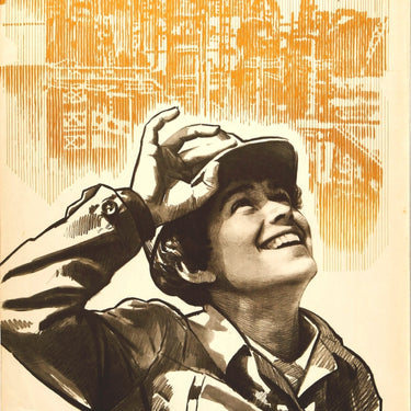 Original vintage Soviet poster - Year 1975 Год - featuring a black and white sketch style image of a smiling worker wearing a construction hard hat looking up in front of an industrial factory background with a red flag flying and the bold lettering in blue below. Most likely a part of a larger triptych poster celebrating International Women's Year that was designated by the United Nations (UN) in 1975, and followed by the United Nations Decade For Women from 1976-1985. Acceptable condition, tears, creasing, staining.