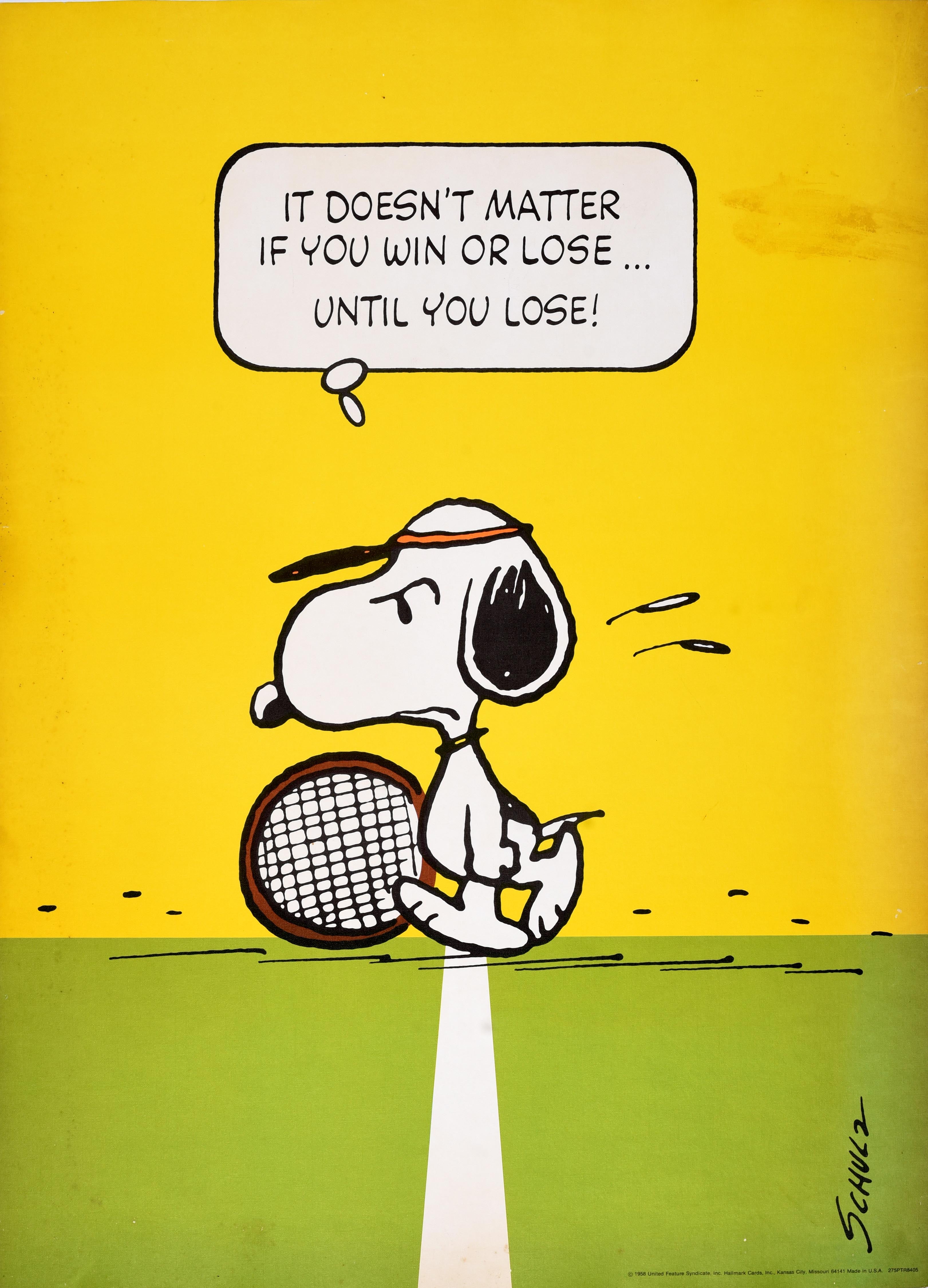 Original vintage poster featuring the iconic comic character Snoopy the Dog by the notable American cartoonist Charles M. Schulz (Charles Monroe Schulz; 1922-2000) - It doesn't matter if you win or lose... until you lose! Fun design showing Snoopy angrily walking across a tennis court with the quote in a speech bubble above. Printed by United Features Syndicate Inc. Issued by Hallmark. Fair condition, restored paper skimming, restored tears, staining, backed on linen.