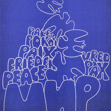 Original vintage Soviet propaganda poster for Peace featuring a great design depicting the outline of a white dove of peace holding a colourful leaf in its beak against the blue background, flying up with other birds through stylised lettering with the word for Peace in different languages - Paix Pace Frieden Pax Mir - and the UN logo of hands releasing a white dove bird in a laurel wreath and the text above. The International Year of Peace in 1986 was held for the 40th anniversary of the establishment of the United Nations (established 1945). Excellent condition.