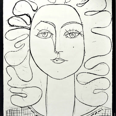 Original vintage art exhibition poster for Picasso Gravures de la Donation George Bloch Fondation Gottfried Keller Musee cantonal des Beaux-Arts Lausanne / Engravings from the Donation George Bloch Foundation at the Museum of Fine Arts in Lausanne from 29 November 1986 to 18 January 1987 featuring artwork by the notable Spanish artist and sculptor Pablo Picasso (1881-1973) of his 1946 drawing of his partner (1943-1953), the artist Francoise Gilot (Marie Francoise Gilot; b. 1921), with the bold title text and event information below. Printed by Bron SA, Lausanne. Large size. Good condition, creasing, tears.