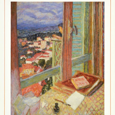 Original vintage art exhibition poster for work by the French artist Pierre Bonnard (1867-1947) at the Tate Gallery London featuring the 1925 painting of The Window by Bonnard depicting a lady on a small balcony looking over the town viewed from a window on the side with a pen and paper and books on the shelf in the foreground and hills in the distance. Excellent condition, minor creasing.