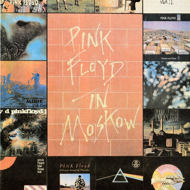 Rare original vintage music concert poster promoting the English rock band Pink Floyd's performances at the Olympic Stadium in Moscow Russia Soviet Union from 3-8 June 1989, part of their A Momentary Lapse of Reason Tour (1987-1989): Pink Floyd in Moskow пинк флойд в Москве. Great design featuring a collage of Pink Floyd album cover art including The Piper at the Gates of Dawn, Atom Heart Mother, Ummagumma, The Wall, A Momentary Lapse of Reason, Obscured By Clouds, Animals, Wish You Were Here, Dark Side of the Moon, Delicate Sound of Thunder, The Final Cut, A Saucerful of Secrets, More and Meddle with the title text in English in a graffiti style on a brick wall in the centre and across the bottom in Russian against the black background. Excellent condition, backed on linen.
