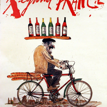 Original vintage advertising poster promoting Regional France. Printed by SOPEXA, agency for international marketing, specialising in food, wine and lifestyle. Great sarcastic design by Ralph Steadman depicting an old Frenchman on a bicycle with baguettes and bottles of wine balanced on his head. Good condition, pinholes, faint staining.
