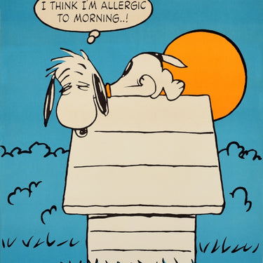 Original vintage Snoopy poster - I Think I'm Allergic to Morning..! - featuring a great illustration by the renowned American cartoonist Charles M. Schulz (Charles Monroe Schulz "Sparky"; 1922-2000) depicting a sleepy Snoopy the cartoon dog lying on top of his wooden dog house with the sun rising on the blue background. c. 1980s. Printed by Hallmark Cards. United Features Syndicate Inc. Good condition, restored pinholes, restored paper losses, backed on linen.
