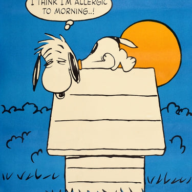 Original vintage Snoopy poster - I Think I'm Allergic to Morning..! - featuring a great illustration by the renowned American cartoonist Charles M. Schulz (Charles Monroe Schulz "Sparky"; 1922-2000) depicting a sleepy Snoopy the cartoon dog lying on top of his wooden dog house with the sun rising on the blue background. c. 1980s. Printed by Hallmark Cards. United Features Syndicate Inc. Good condition, pinholes, tears, folds, creasing.