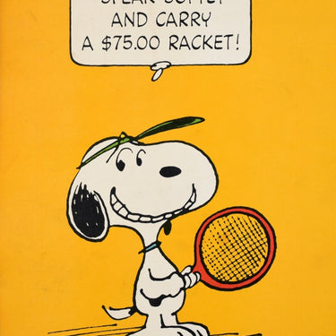 Original vintage Snoopy poster - Speak softy and Carry a $75.00 Racket! - featuring a fun and colourful illustration by the renowned American cartoonist Charles M. Schulz (Charles Monroe Schulz "Sparky"; 1922-2000) depicting Snoopy the cartoon dog smiling out to the viewer while holding a tennis racket and wearing a visor. Printed by Hallmark Cards. United Features Syndicate Inc. Good condition, restored pinholes, staining, backed on linen.