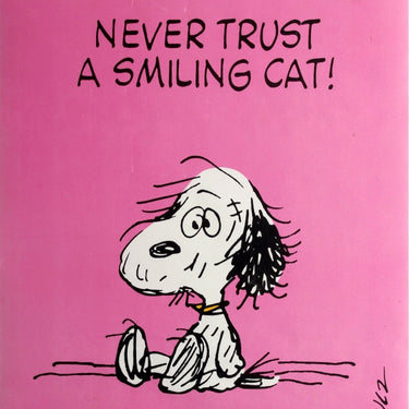 Original vintage advertising poster "Never trust a smiling cat!" featuring a colourful image by the notable American cartoonist Charles M. Schulz (Charles Monroe Schulz; 1922-2000), of the character Snoopy sitting down in a mess of confusion and defeat, set against a pink background with the stylised text above. Published by Hallmark Cards Inc., Kansas City, USA. Good condition, pinholes in corners, creases, scratches and waving.
