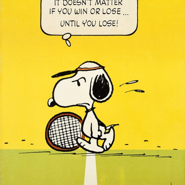 [ON RESERVE 2/9/2024] Original vintage poster featuring the iconic comic character Snoopy the Dog by the notable American cartoonist Charles M. Schulz (Charles Monroe Schulz; 1922-2000) - It doesn't matter if you win or lose... until you lose! Fun design showing Snoopy angrily walking across a tennis court with the quote in a speech bubble above. Printed by United Features Syndicate Inc. Issued by Hallmark. Good condition, restored crease marks, staining, some bumps on poster from reverse side, backed on linen.
