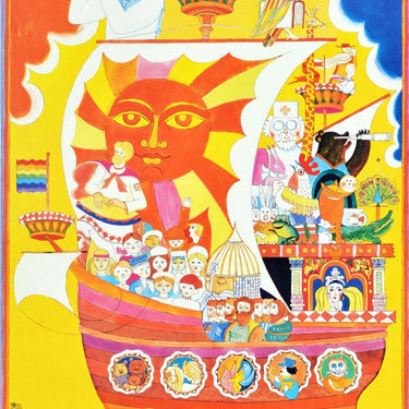 Original vintage advertising poster for the Mezhdunarodnaya Kniga Международная Книга international bookshop in Moscow featuring a bright and colourful illustration of a sailing ship carrying characters from Russian fairy tale stories including Doctor Aybolit (ouch it hurts), a fox, giraffe, fish in a bowl, frog, peacock, crocodile, an owl holding a book under its wing and other animals, Kolobok (the Little Roll), Buratino (Pinocchio), a princess and characters from works by Alexander Pushkin and Alexey Tolstoy and other authors, a moon and sun, a rainbow flag and the text in French below the image on the blue waves of the sea - Buy Soviet children's books / Achetez les livres Sovietiques pour enfants. Very good condition, minor creasing, small tears on edges.