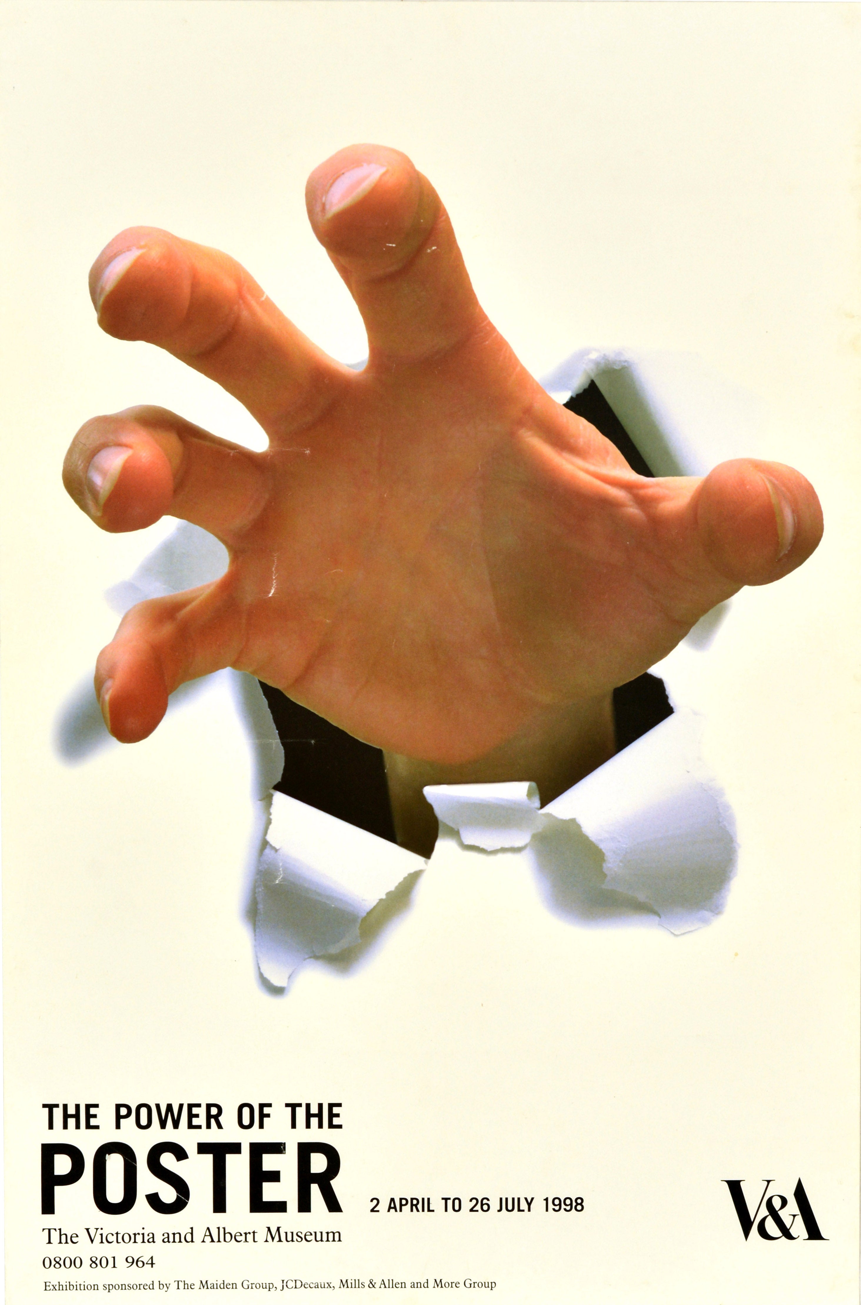 Original vintage advertising poster for an exhibition at the Victoria and Albert Museum - The Power of the Poster - held from 2 April to 26 July 1998 featuring a hand bursting through paper to grab attention leaving a torn hole on the white background with the bold text, V&A logo and sponsorship information below - Exhibition sponsored by The Maiden Group, JCDecaux, Mills & Allen and More Group. Good condition, creasing, minor staining, tears.