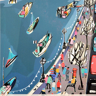 Original London Transport poster - Winter Fun River walks by Bus, Tube, Overground and River - featuring fun and colourful design by Anna Hymas depicting people in warm patterned coats and hats walking along the Chelsea Embankment in the winter with lights on the trees and lampposts, boats sailing and moored on the River Thames by Albert Bridge and Cadogan Pier, taxis and cars crossing the river and a number 170 bus on the road behind a person reading on a bench, people walking their dog and posting a letter in a red post box with birds on the side, the text, roundel and logos below. Mayor of London TfL Transport for London Every Journey Matters. Very good condition, creasing in top left corner.