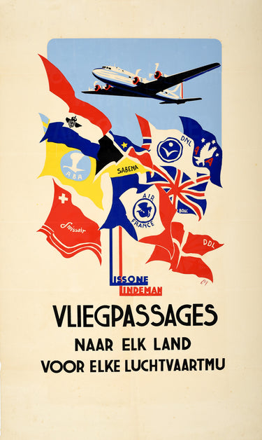 Original vintage travel advertising poster for Lissone Lindeman Vliegpassages Naar Elk Land Voor Elke Luchtvaartmu / Air Passages To Any Country For Any Aviation featuring a great illustration depicting a propeller passenger plane flying in the blue sky over the colourful flags of various airline logos - Swissair, American Airlines, ABA, Sabena, KLM, Air France, DDL, BOAC and DNL - leading down to the company name in bold blue and red lettering. In 1876 Jacob Lissone founded the first European travel agency in the Netherlands in 1876, partnering with Lindeman in the 1920s. Large size. Good condition, restored folds, restored paper losses, restored creasing, foxing, staining, backed on linen.