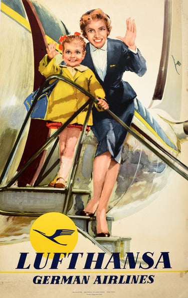 Original vintage travel advertising poster for Lufthansa German Airlines featuring a smiling air hostess in a smart uniform waving to the viewer from the steps of a plane with a young girl in a yellow coat and red bows in her hair holding a blue and yellow airline bag on her arm as she's about to board, the text in bold blue lettering with the Lufthansa flying crane logo below. Good condition, restored paper losses, restored tears, staining, backed on linen.