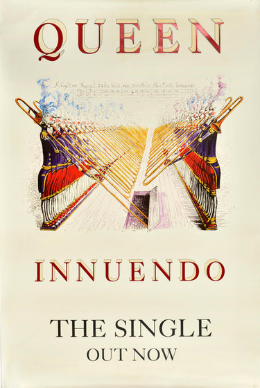 Original vintage music advertising poster - Queen Innuendo the single out now - featuring a colourised lithograph by the French illustrator and caricaturist Jean Ignace Isidore Gerard (Grandville; 1803-1847) from his 1844 collection Un Autre Monde / Another World titled Melody for 200 Trombones depicting a brass band in bright uniforms holding trombones in a long line fading into the distance with the instrument of the first musician on the left extending into an open wooden plank on the stage floor in the foreground and the music notes and lyrics adapted to represent the song by Queen, the title above and below the image. One of the biggest and most successful rock bands in the world, the British group Queen was formed in 1970 by Freddie Mercury (Farrokh Bulsara; 1946-1991), Brian May (b. 1947) and Roger Taylor (b. 1949), with John Deacon (b. 1951); Innuendo was their 14th studio album. Large size. Good condition, creasing, staining.