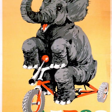Original vintage advertising poster for a performance by Delhi the cycling elephant at the Zirkus Aeros circus featuring a fun colourful illustration of a grey elephant riding a red tricycle with the bold orange, white and green stylised lettering on the pale yellow background. Founded in Leipzig in 1941 by the circus performer and animal tamer Cliff Aeros (Julius Jager; 1889-1952), the Aeros / Eros circus was merged into the VEB Zentral-Zirkus / GDR State Circus in 1961. Good condition, folds, tears, staining, pinholes.