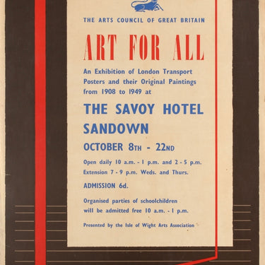 Original vintage art exhibition poster published by London Underground and the Arts Council of Great Britain (founded 1946) - Art For All an exhibition of London Transport Posters and their Original Paintings from 1908 to 1949 at the Savoy Hotel Sandown / October 8th to 22nd open daily Organised parties of school children will be admitted free 10am-1pm / Presented by the Isle of Wight Arts Association. Great design by the notable artist Tom Eckersley (1914-1997) against a brown shaded background using lines and a red frame in perspective to symbolise transport and the posters and artwork on display with the text in stylised blue and red letters and the London Underground roundel logo below. Printed by Baynard Press. Fair condition, small tears and creases in margins.
