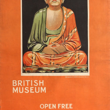 Original vintage advertising poster for the British Museum open free from 10a.m. till dusk British Museum & Holborn stations. Great design featuring a colourful depiction of the serene Tang Dynasty period Buddhist Apostle statue displayed in the museum's Buddhist Room with the text in white against the orange background below. Printed by Vincent Brook Day & Son Ltd. Lith., London. Fair condition, small pieces of paper added in top and bottom left corners, pinholes, small tears in margins, image printed on a separate glued sheet of paper, backed on linen.
