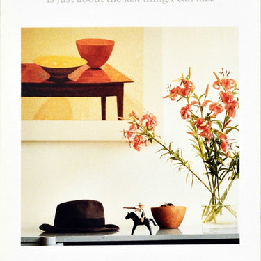 Original vintage London Underground poster featuring a side table with a hat and flowers in a vase on it, a framed artwork on the wall and a child's toy horse with the rider holding a gun to the hat in front of a decorative bowl, the caption above and rest of the text with the London Underground roundel below - To come home in the evening to find the kids have carried out their own form of anarchy is just about the last thing I can face. Art on the Underground photography Martin Parr Signs of the Times BBC 2. Excellent condition.