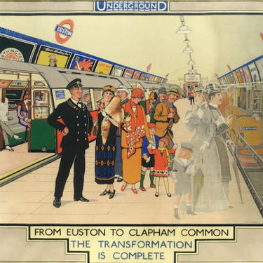 [ONE RESERVE PENDING PAYMENT] Original vintage London Underground poster promoting the reopening of Euston and Clapham Common stations following extensive modernisation and reconstruction work - From Euston to Clapham Common the Transformation is Complete - featuring a fantastic design by the British artist Richard T. Cooper (1884-1957) showing passengers on the station platform at Euston with a railway worker in smart uniform welcoming a family in fashionable modern clothing and workers to the new underground train on the left and a ghostly image of people in stylish Edwardian dress waiting for the arrival of an earlier tube train model outlined in white, with advertising posters for food and drink and other products from the period on the walls below the roundel signs on both sides, and more passengers and soldiers in uniform boarding the new train by the stairs with the sign reading "Way Out To Street Euston Main Line Hampstead Line" in the background, the title text above and below with additional information reading "The City And South London Railway re-opened 1924 at an extra cost of £3,000,000." on the left and "The City And South London Railway opened 1890 Its total cost was £3,000,0000." on the right side of the border. Printed by Johnson, Riddle & Co. Horizontal. Large size. Framed. Good condition, minor losses and tears on margins, light creases, seems to be backed on old linen. Not examined out of frame; poster will be sent unframed for online orders.
