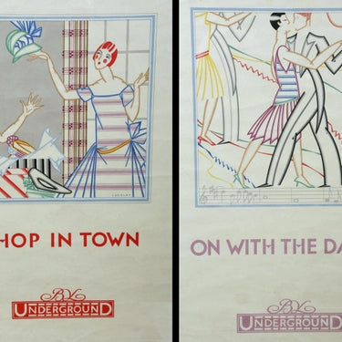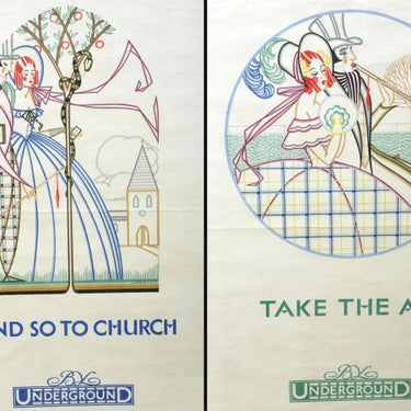 Set of four rare original vintage posters issued by the London Underground: Take the air by Underground, Shop in town by Underground, And so to church by Underground, On with the dance by Underground. Colourful and stylish Art Deco images designed by Stanislaus S Longley (Stanislaus Soutten Longley; 1894-1966). Published by the Underground Electric Railway Company Ltd, printed by Balding and Mansell. Framed in identical silver frames. Good condition, light creases.