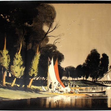 Original antique travel advertising poster for London Underground featuring a scenic riverside landscape in Teddington showing smartly dressed people enjoying a picnic break on sailing boats on the shore of a calm River Thames with a Union Jack flag flying at the top of the first mast, a group of people punting on another boat, people walking along the tree lined embankment path, a man fishing and more sails visible behind a wooden breakwater. Artwork by the British painter, engraver and lithographer Anthony Raine Barker (1880-1963). Printed by Johnson Riddle & Co. Ltd. Large size. Horizontal. Excellent condition, tear in right margin, corners cut to rounded.