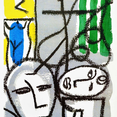 Original vintage London Underground poster - Whitechapel Art Gallery next door to Aldgate East station - featuring an abstract design depicting faces, one smoking a pipe and the other face lying on the side, and a torso against a colourful background. Good Place, Good Work by Bruce McLean. Commissioned by the Whitechapel and London Underground. Excellent condition.