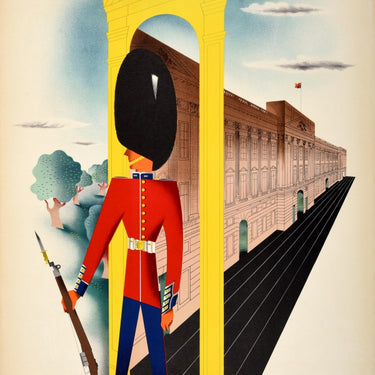 Original vintage London Transport poster featuring a colourful mid-century illustration by the painter and poster designer John Bainbridge (1919-1978) depicting a Royal Guard / Queen's Guard in smart military uniform and a bearskin hat holding a bayonet rifle gun and standing outside a sentry box marked ER II with a crown above, a flag flying on top of Buckingham Palace with lines on the ground leading the eye to the horizon below light clouds with trees on the side and the London Underground roundel logo below. John Bainbridge designed posters for London Underground from 1953 to 1957. Printed by the Baynard Press. Good condition, restored tears, restored paper losses on edges, browning, minor staining, backed on linen.