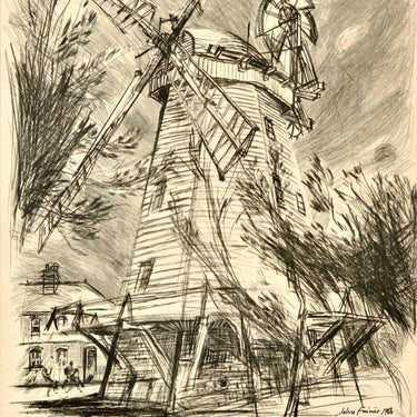 Original vintage London Transport poster featuring a great black and white drawing by John Finnie (b.1935) depicting people walking next to a smock mill windmill with trees in the foreground, the text and London Underground roundel in red below - Windmills link us with less hurried days. Some of these rickety sentinels still remain in London's countryside, proud reminders of the miller's constant battle with his fickle servant, the wind. A free London Transport leaflet lists the more worthy veterans; write for a copy to the Public Relations Officer, 55 Broadway, S.W.1. Then buy a Weekender ticket (#1 at any Underground station or bus garage), consult your bus map and pay your respects. Printed by Leonard Ripley and Co. Ltd London. Good condition, creasing, staining, tears.