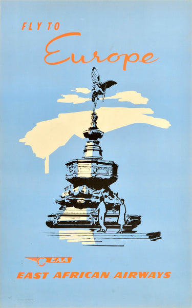 Original vintage travel poster for East African Airways - Fly to Europe - featuring an illustration of people walking in front of the iconic Eros Fountain at Piccadilly Circus in London with the title in stylised lettering above and with the airline's leaping lion logo below. Founded in 1946 EAA was jointly run by Kenya, Tanzania and Uganda until its dissolution in 1977. Printed in East Africa by Aerad Lithographic Printers. Good condition, creasing, tears, pinholes, pencil markings.