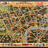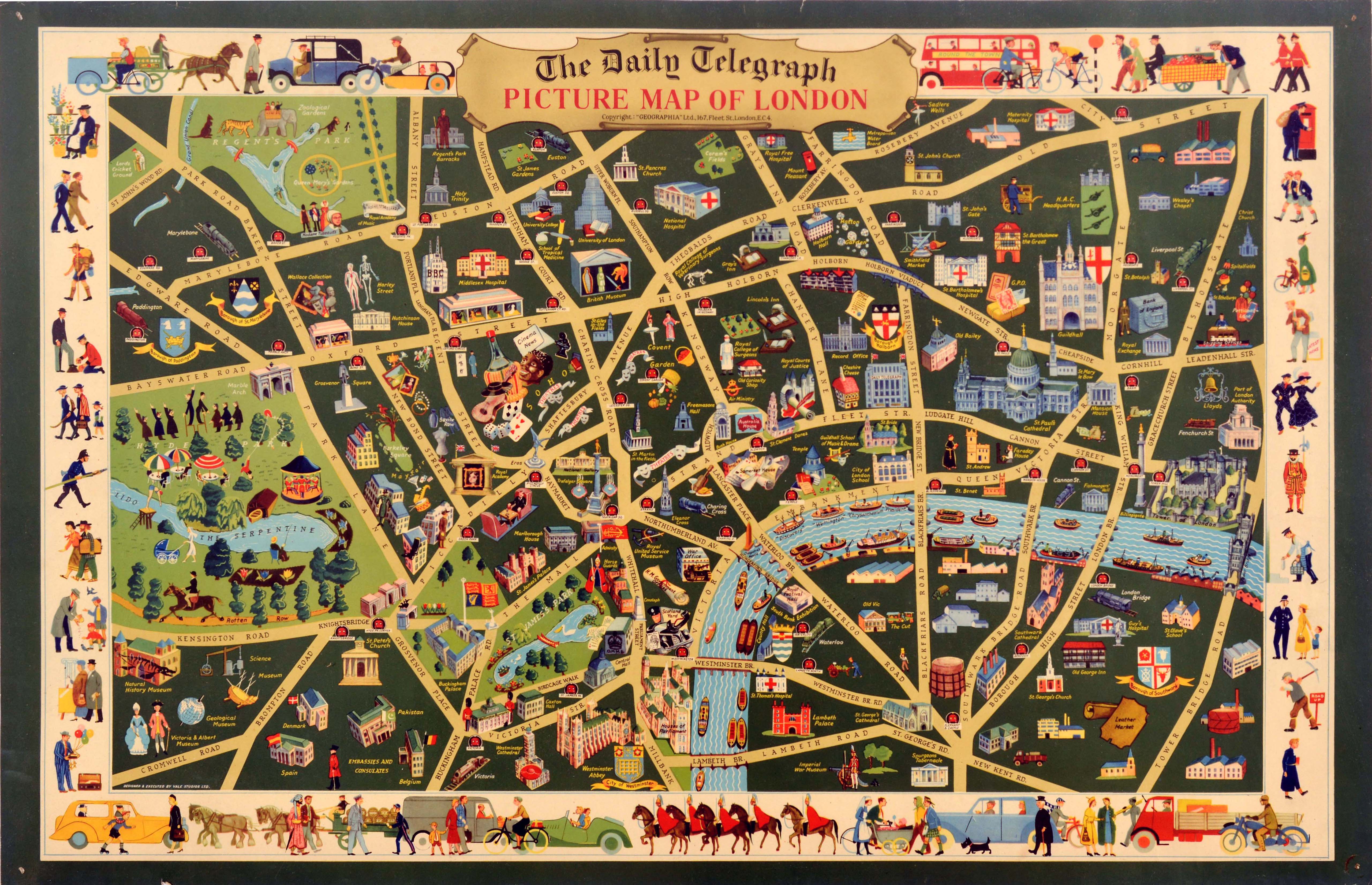 Original vintage map poster - The Daily Telegraph Picture Map of London - featuring a colourful mid-century pictorial map of landmark buildings, museums and galleries, historic places of interest, train stations, notable people, the main streets in the centre of town, universities and medical schools, gardens and parks spanning the area from Lord's Cricket Ground and London Zoo in Regent's Park in the north, Guy's Hospital and the Tower of London in the east, the Natural History Museum and Hyde Park in the west, and the Imperial War Museum and Westminster Abbey in the south including illustrations of Buckingham Palace, Nelson's Column, the Royal Festival Hall, St Paul's Cathedral and the Houses of Parliament with the bridges shown from Lambeth Bridge to Tower Bridge and boats on the River Thames and red tube carriages marking London Underground stations, all framed by images of London types and characters including Beefeaters and Royal Guards, a Pearly King and Queen dancing, an iconic red London bus, cyclists, school children in uniform, a flower seller, shoe cleaner, fireman, a child on roller skates, horse drawn carts, a milkman and a policeman with the title in a scroll above. The Daily Telegraph newspaper was founded in 1855. Copyright Geographia, London. Designed and executed by Vale Studios Ltd. Horizontal. Good condition, pinholes, tears, staining, creasing.