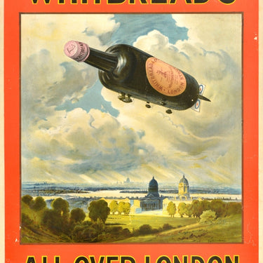 Original antique drink advertising poster - Whitbread's All Over London - featuring a fun illustration of a stout bottle as a zeppelin with RAF roundels on the aircraft tail flying above the city with the silhouette of St Paul's Cathedral lit up by the sun shining through the clouds in the distance, the River Thames and trees in what looks to be Greenwich Park below, the bold title caption in black and yellow on the border. Painting by the watercolour artist Cyril Ward (1863-1935). The brewery Whitbread of London was established by Samuel Whitbread in 1742; by the 1780s it was the largest brewery in the world; the company now focuses on its leisure and hospitality businesses, selling the Whitbread Beer Company breweries in 2001. Printed by Sir Joseph Causton and Sons Limited, Designers and Printers London. Fair condition, creasing, repaired tears, paper skimming, staining, backed on linen.