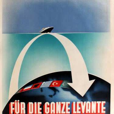 Original vintage travel advertising poster: fur die ganze levante Adriatica Venedig. Great Art Deco image featuring an arrow with a line of flags passing over Italy on a globe with a ship on the horizon above. Very good condition, minor bumps, tears and soiling on margins.