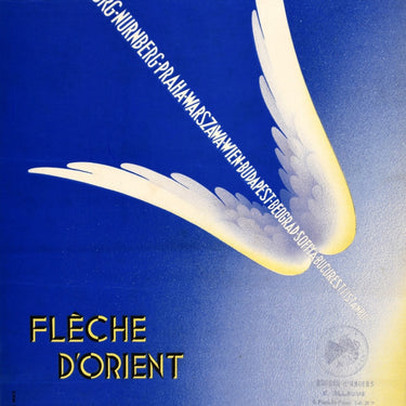 Original vintage travel advertising poster for Air France Fleche D'Orient - Arrow of the Orient featuring a dynamic winged arrow design by the Italian artist Paolo Federico Garretto (1903-1991) listing the places served by the airline in white letters with wings flying on the sides - Paris, Strasbourg, Nuremberg, Prague, Warsaw, Vienna, Budapest, Belgrade, Sofia, Bucharest, Istanbul - against the deep blue sky and pale yellow corner with the stylised black and yellow lettering and seahorse (pegasus / hippocampe aile) logo in the C below. Very good condition, restored pinholes, ink stamp, backed on linen.