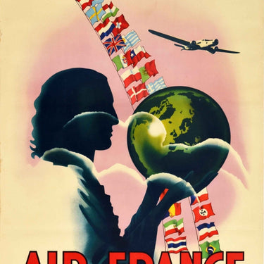 Original vintage Air France poster advertising Passagerer, Post og Gods over hele Verden / Passengers, Mail and Freight Worldwide. Colourful Art Deco design depicting the silhouette of a person holding a globe of the earth in front of a string of national flags leading to the winged seahorse (pegasus / hippocampe aile) Air France logo above the shaded pink sky background, a plane flying over the light clouds with the bold title text below. Founded in 1933 Air France is the flag carrier airline of France. Good condition, creasing, tears, staining, small paper losses.