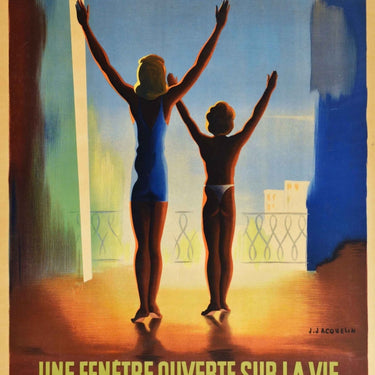 Original vintage sport and health propaganda poster issued by the General Commission for General Education and Sports - Une Fenetre ouverte sur la vie / An open window on life - featuring a great image by Jean Jacquelin (1905-1989) of two people stretching and doing their physical exercise in front of an open window for fresh air with a three ring Olympic style logo above in the blue, white and red colours of the French flag and the text above and below - Commissariat General Education Generale Sports. Printed by Bedos & Cie, Paris. Large size. Excellent condition, restored tear, backed on linen.