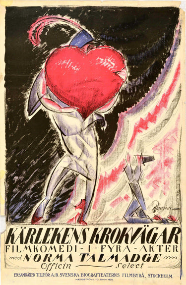 Original vintage cinema poster for the 1920 American silent film She Loves and Lies released in Sweden as Kärlekens krokvägar / The twists and turns of love, directed by Chester Withey and starring Norma Talmadge, Conway Tearle and Octavia Broske. The poster features a design by Swedish illustrator and advertising artist Eric Rohman (1891-1949), depicting a lady in a white dress holding a large red heart and a silhouette of a gentleman in a top hat and tuxedo on his knees. Printed by Haeggström Lito, Stockholm. Fair condition, tears, creasing, folds, staining, paper losses.