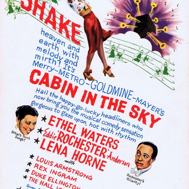 Original movie trade ad for a film, Cabin in the Sky. From the 1920s, film studios would commission the finest artists of the day to create elaborate trade ads, which were sent to cinemas in an effort to get them to book that specific movie. Cabin in the Sky is an African-American musical directed by Vincente Minnelli and one of the first major all-black star movies produced by a major studio, intended to be shown to both white and black audiences. The film was nominated for an Academy Award for Best Song. Fantastic artwork of a dancing couple with an angel wearing a halo looking down from a cloud and a devil looking up from a flaming fire at them. Design by Albert "Al" Hirschfeld (1903-2003), an American caricaturist best known for his black and white portraits of celebrities and Broadway stars. Good condition, staple holes on top left corner, minor dents, staining. Printed on both sides.