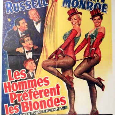 Original vintage movie poster for the 1953 film Gentlemen Prefer Blondes starring Jane Russell, Marilyn Monroe and Charles Coburn. Good condition, folded, pinholes, tape mark on one corner.