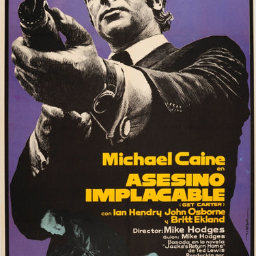 Original vintage movie poster for the Spanish release of the classic British crime film Get Carter / Asesino Implacable based on the novel Jack's Return Home by Ted Lewis, directed by Mike Hodges and starring Michael Caine (as the gangster Jack Carter), Ian Hendry, John Osborne and Britt Ekland. Fantastic design featuring a view looking up at the dominating figure in black and white of Michael Caine wearing a suit and holding a gun with a movie still of Carter and a lady below, the text in stylised coloured letters. Artwork by Macario Gomez Quibus (Mac; b 1926). Printed in Spain by Olmarca Aldus S.A. Very good condition, restored small tears on folds, backed on linen.