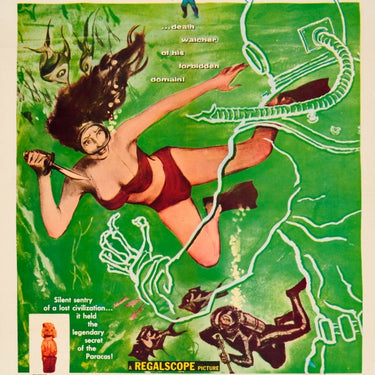 Original vintage movie poster for an adventure film Ghost Diver about a South American scuba diver looking for lost treasure directed by Richard Einfeld and Merrill G. White and starring James Craig, Audrey Totter, Nico Minardos and Pira Louis. Dynamic design featuring a lady underwater wearing a bikini with fins and a mask and holding up a knife with fish and an armed scuba diver in the background and the ghostly outline of a diver in the foreground with skeleton hands, the stylised title text above and credits with images of the main characters below, an idol with text on the side: "Silent sentry of a lost civilization... it held the legendary secret of the Paracas!" Very good condition, restored folds and minor losses, backed on linen.