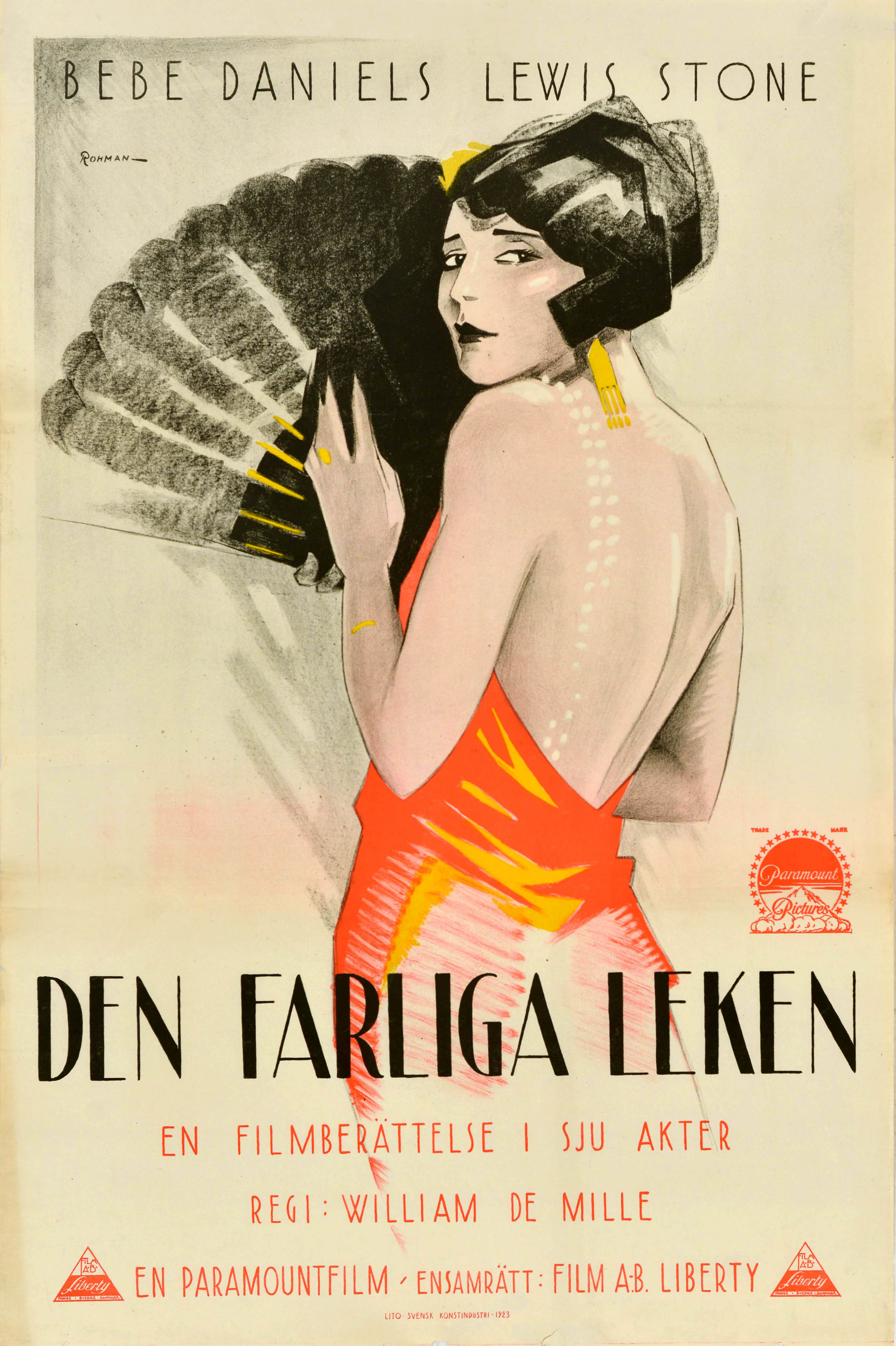 Original antique Swedish cinema poster for an American silent drama film - The World's Applause / Den Farliga Leken (The Dangerous Game) - directed by William C. deMille and starring Bebe Daniels as Corinne d'Alys, a Broadway star, and Lewis Stone as John Elliott, her producer, featuring a great design by the Swedish artist Eric Rohman (1891-1949) depicting the Broadway star in a backless orange dress and holding a feather fan, looking at the viewer with the names of the main actors above and the title in black with the rest of the text, credits and logos for Paramount-Film and Film AB Liberty below. Fair condition, staining, folds, creasing, tears, paper losses.