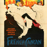 Original vintage movie poster for a musical comedy drama film - French Cancan - written and directed by Jean Renoir and starring Jean Gabin, Francoise Arnoul and Maria Felix with appearances by famous French singers including Edith Piaf, Patachou, Andre Claveau and Jean Raymond. Colourful artwork by the notable graphic artist Rene Gruau (Renato de Zavagli; 1909-2004), in a style reminiscent of Henri de Toulouse-Lautrec's Moulin Rouge art, depicting dancers on stage with blue and green feather in their hats, singing and dancing the can-can, holding up their billowing layered skirts and kicking out their legs in black stockings with silhouettes of smartly dressed ladies and gentlemen in top hats in the background, the bold stylised title text and credits below. Printed by Richier-Laugier, Paris. Large size. Good condition, restored folds, restored tears, small restored paper losses, staining, backed on old linen.