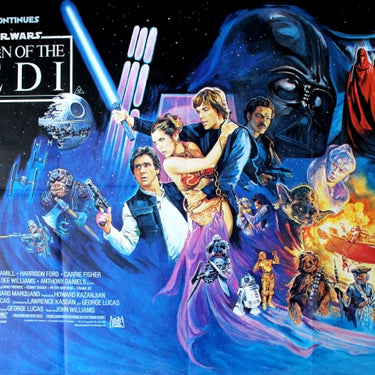 Original vintage movie poster for the classic film, Star Wars: Episode VI - The Return of the Jedi, starring Mark Hamill as Luke Skywalker, Harrison Ford as Han Solo, Peter Mayhew as Chewbacca, Carrie Fisher as Princess Leia, Alec Guinness as Obi-Wan Kenobi, Frank Oz as Yoda, David Prowse/James Earl Jones as Darth Vader, Billy Dee Williams as Lando Calrissian, Anthony Daniels as C-3PO and Kenny Baker as R2-D2. The Saga Continues... Released in 1983, this movie was the last episode of the original Star Wars trilogy. This first release quad poster designed by the English artist and illustrator, Ronald William "Josh" Kirby (1928-2001), is the first version that excludes the Ewok, which was added later on next to Han Solo. Horizontal. Excellent condition, folded as issued.