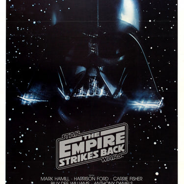 Original vintage advance poster for the forthcoming release of the second film in the original classic sci-fi Star Wars trilogy: The Empire Strikes Back - The Star Wars saga continues - Coming to your galaxy this Summer - released in 1980, directed by Irvin Kershner and starring Mark Hamill, Harrison Ford, Carrie Fisher, Billy Dee Williams, Anthony Daniels, David Prowse, Kenny Baker, Peter Mayhem and Frank Oz. Fantastic artwork featuring a dark and threatening image of Darth Vader against a space background with the text above and below in stylised white and grey letters. Good condition, restored folds, minor bumps on left margins, backed on linen.